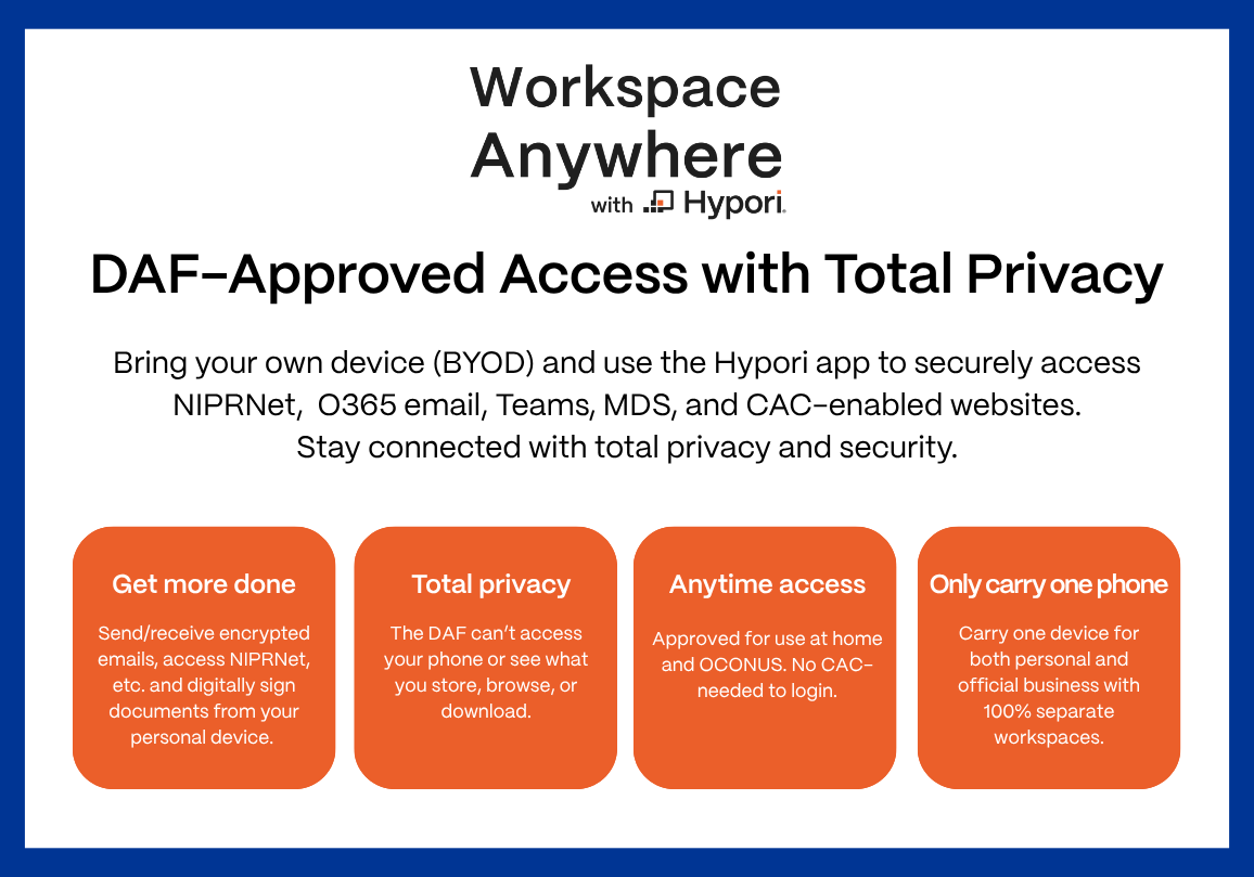 Hypori has been that rare “win” with AF IT acquisitions: simple setup, easy to use, and it actually works as advertised. Hypori has been especially useful in my situation as I often have to commute to different locations and Hypori allows me to answer/reference things on the go without carrying around a CAC-enabled laptop or binder full of CUI/FOUO papers.